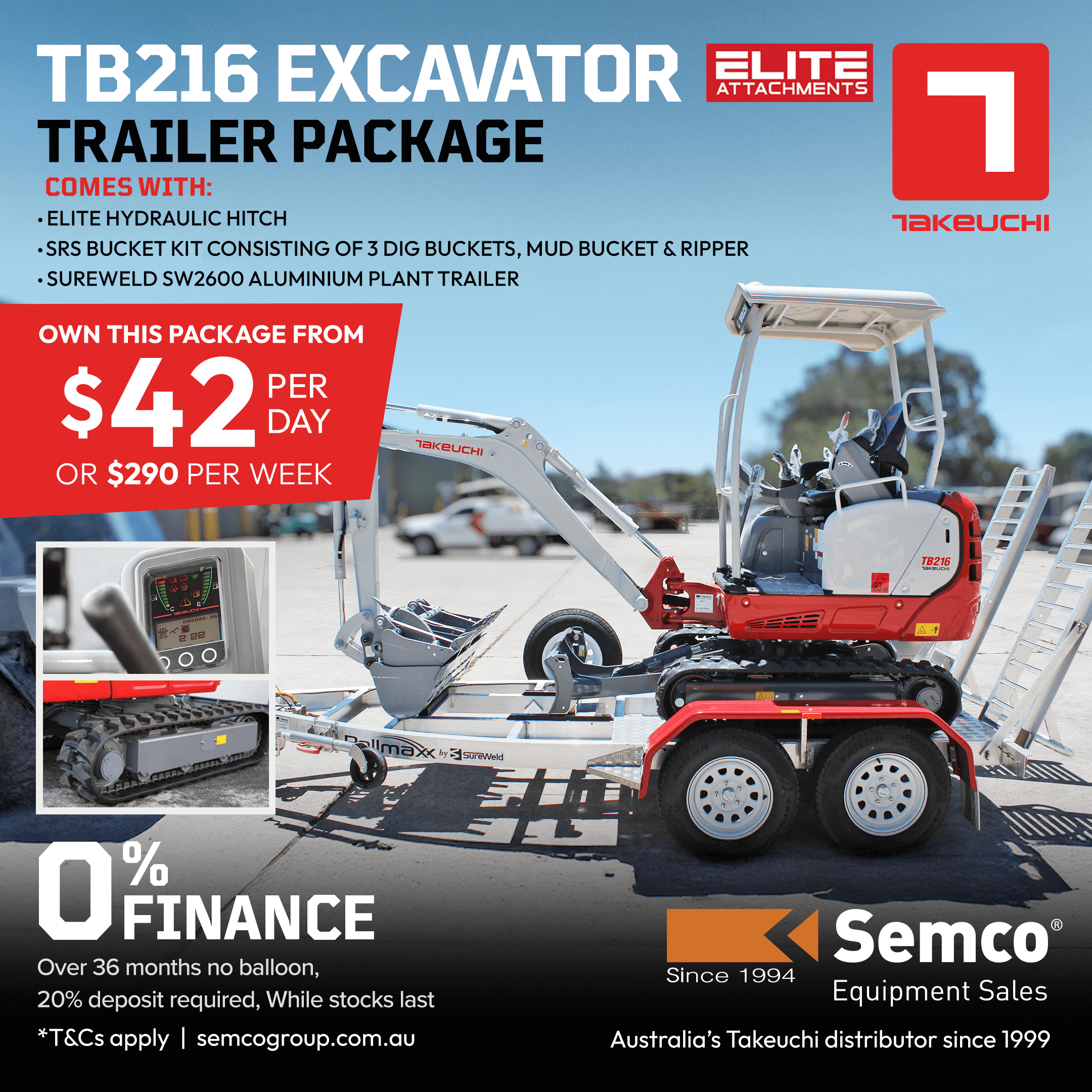 With 0% finance available, you can own this complete TB216 trailer package from just $42 per day or $290 per week. The package includes an Elite hydraulic hitch, a full SRS Bucket kit and ripper set, and a Sureweld SW2600 aluminium plant trailer, making transport and attachment changes quick, easy and efficient. Backed by Semco’s 26+ years as Australia’s Takeuchi distributor, this is a turnkey solution built for serious operators who want maximum value and minimal downtime.